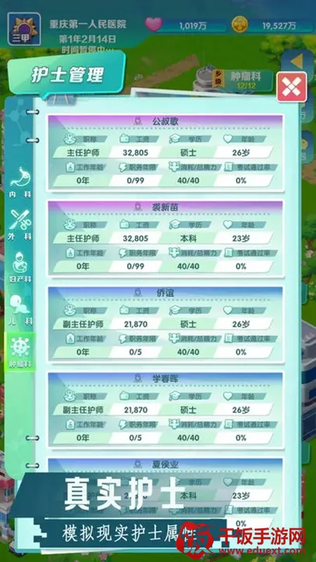 玩法上,前期按等级目标逐步升级科室和科研,别越级;中期多用社会招聘找性价比高的副教授,名校招聘攒人才;通过教学任务升级科室,中期保证各科室有教授再升;后期世界级科室配备2到3名主任医师并升至满级。每年12月20号满足条件可进行医院评级。