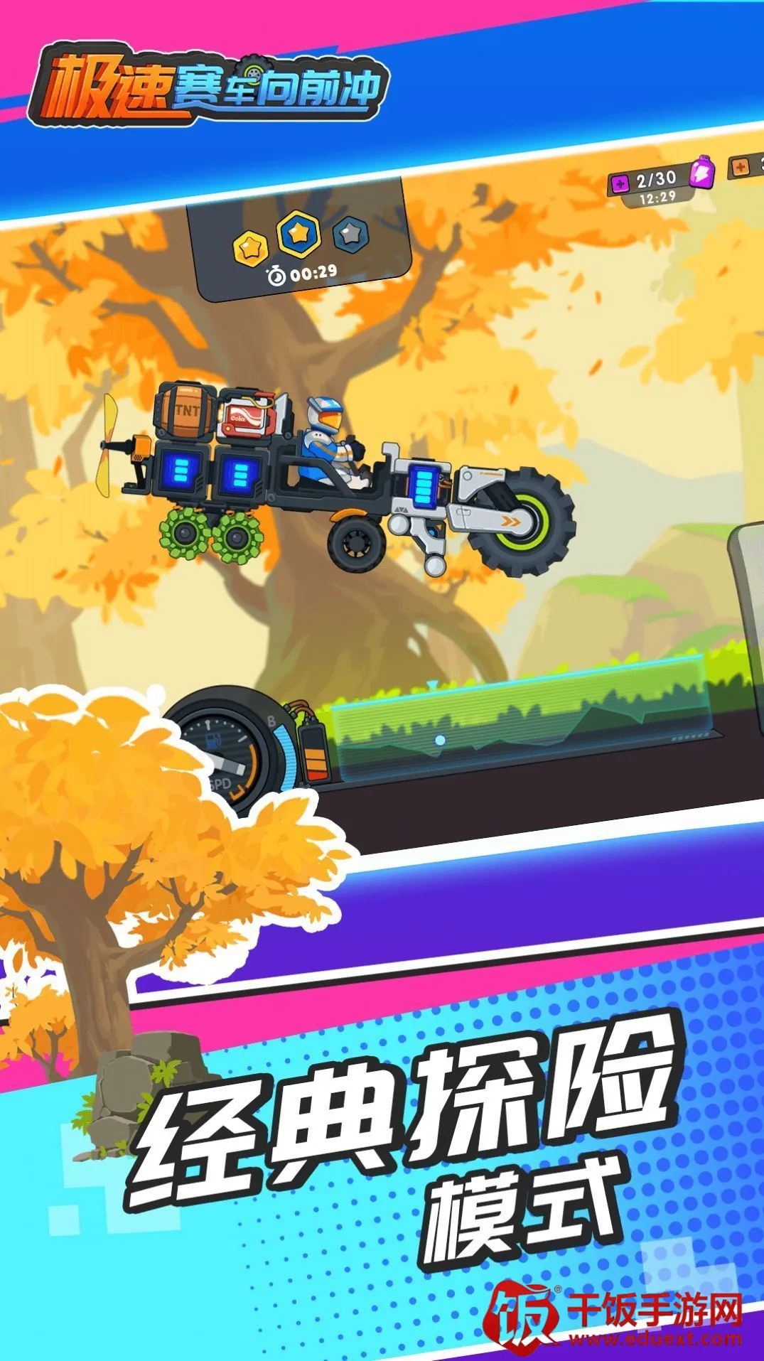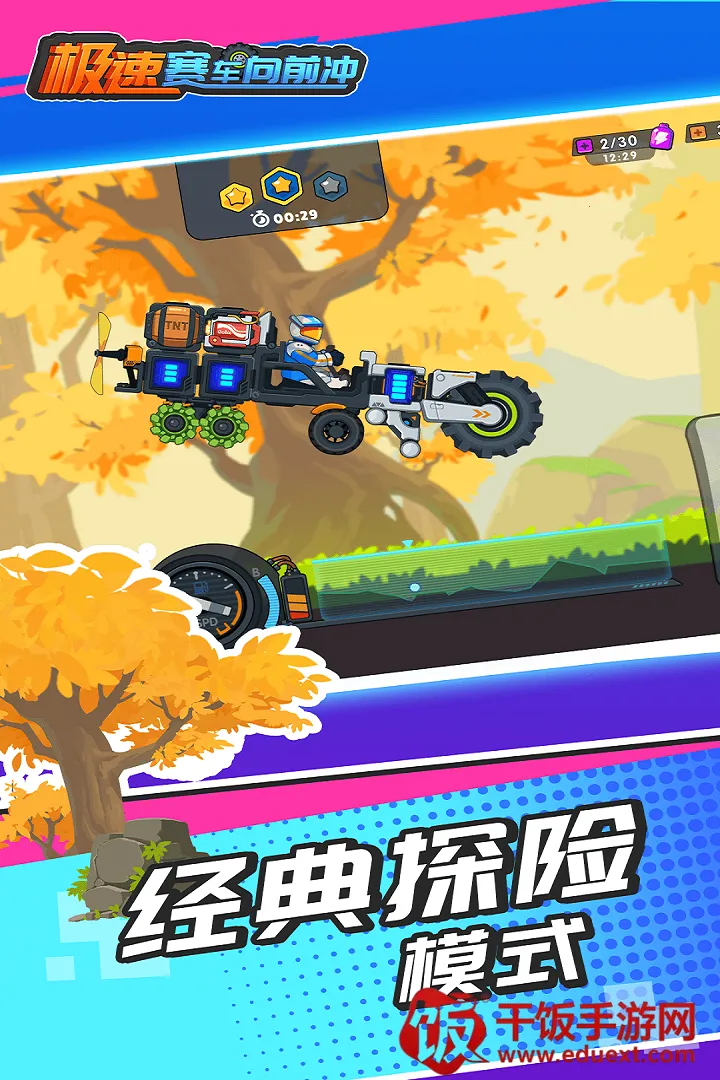 极速赛车向前冲是一款融合竞速与车辆组装的游戏。玩家在多样赛道驾驶自组赛车,含多种地形。可改装车辆,还有丰富玩法如闯关、任务等,内置菜单有绿色钥匙功能可解锁隐藏赛车及特殊道具。