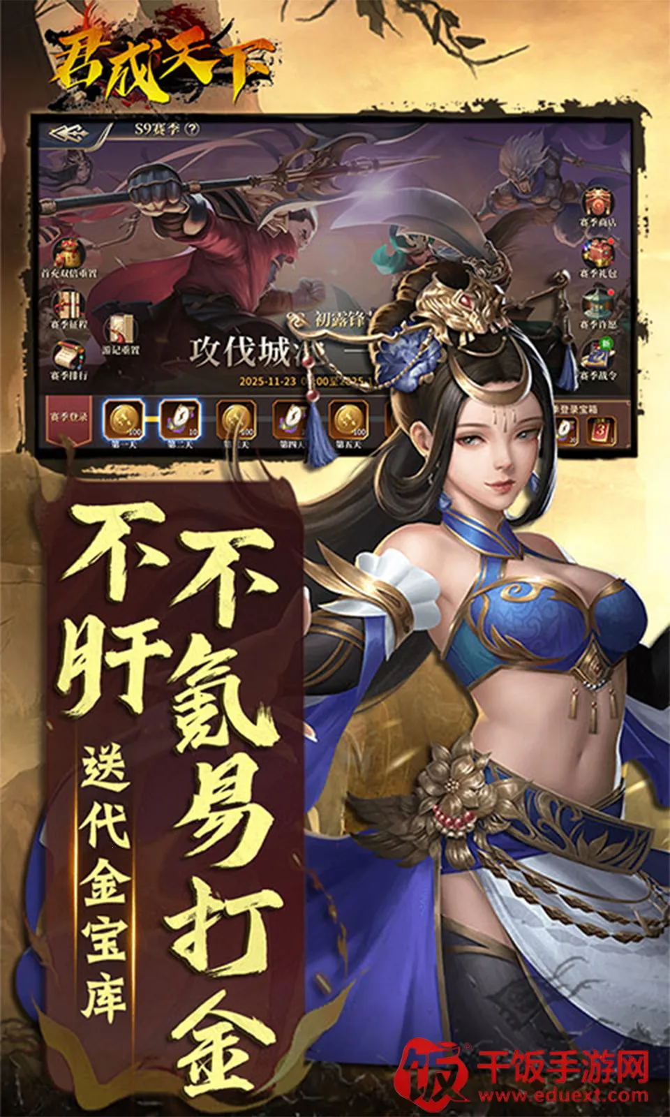 君成天下是一款以三国为题材的争霸游戏,0.1折畅玩,每日送4000元代币。上线送VIP15,可自建主城、征召名将,还有百万真充、代金宝库等。不肝不氪易打金,7日送自选SS,凭谋略定天下,尽揽三国英杰美女。