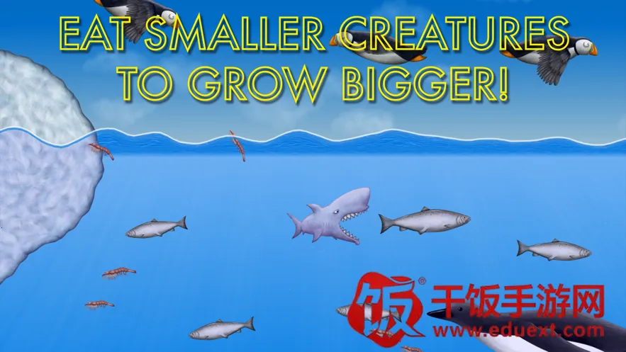 2. 不断成长进化的玩法:通过吞噬小鱼获得奖励,使体型变大,最终进化成超大鲨鱼,享受逐步强大的过程。