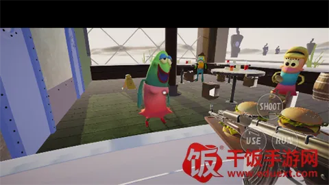 2、进入游戏后,章鱼哥来到一个汉堡店工作。注意观察,屏幕上会出现三个操作按钮。当你的鼠标光标移动到目标物体上时,点击“use”即可将其拾起,而点击“run”则能帮助你加速移动,迅速完成任务。
