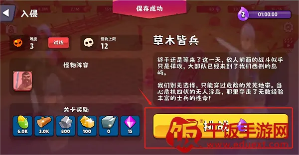 点击入侵之后,可以看到右上角有一个试炼按钮。点击试炼,会升级难度,增加敌人数量及战力。但是后续可以获取更多的紫宝石哦!