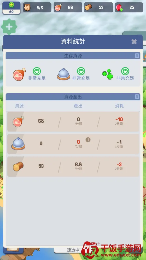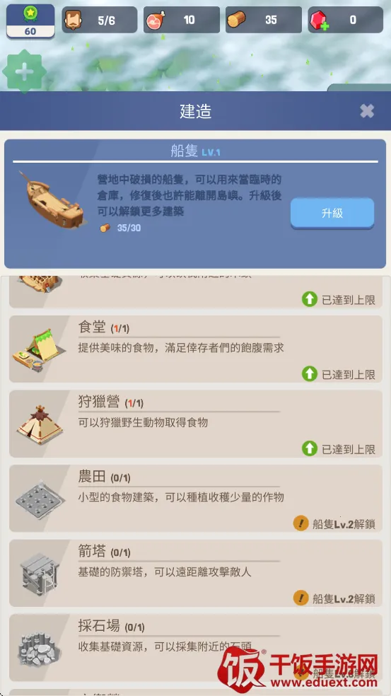 4.点击建造,可以建造许多不同功能的建筑包含食堂、伐木场、帐篷等随着等级越高可以建造的建筑更多