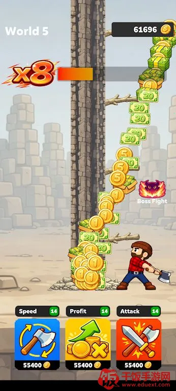 4. 首领挑战与新区域解锁:随时挑战首领,击败后解锁新区域,木材价值更高,能带来更快进度、更高收益和丰厚奖励。