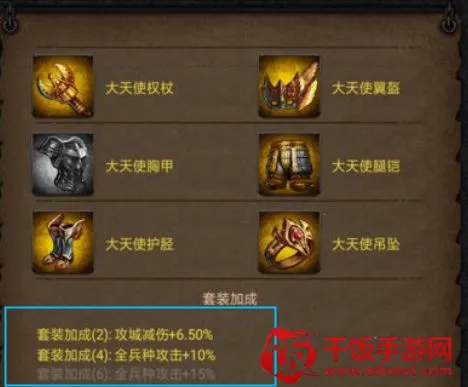 5件金色大天使,没有做任何强化,依然可以激活套装加成(4)。如果身上凑齐6件金色大天使,则可以激活最下面-套装加成(6)对应的属性。