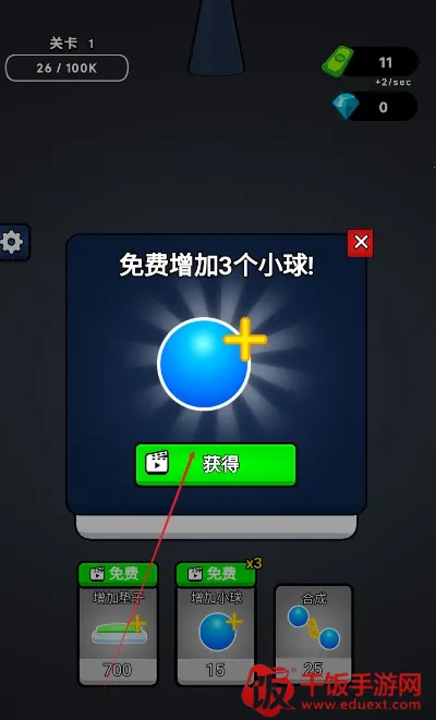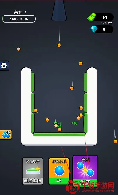 2. 免广告模式助力:通过免广告模式,能获得更多小球和垫子,不断增加小球数量点击合成,助力完成关卡任务。