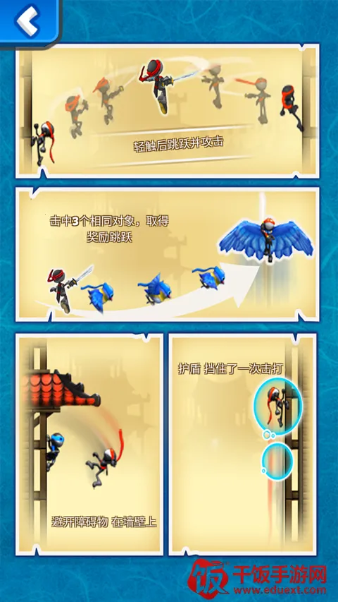 游戏画面精美,有蓝色的小鸟,有拿刀的忍者,有锐利的飞刀,会让玩家眼前一亮,激发起玩家对游戏的兴趣。