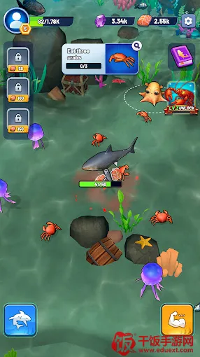2. 独特成长体系:从一条小鲨鱼起步,通过不断吞噬生物,在食物链中攀升,逐步成长为海洋霸主。每一次吞噬都带来成长,解锁更多技能,让玩家充分感受变强的过程。