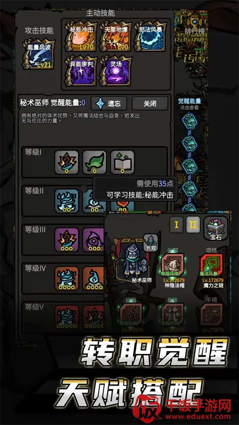 3、玩法多样:有秘法系统、秘境,几十种技能搭配,丰富任务模式与高自由度养成玩法,轻松挂机升级,解锁装备武器,享受升级乐趣。