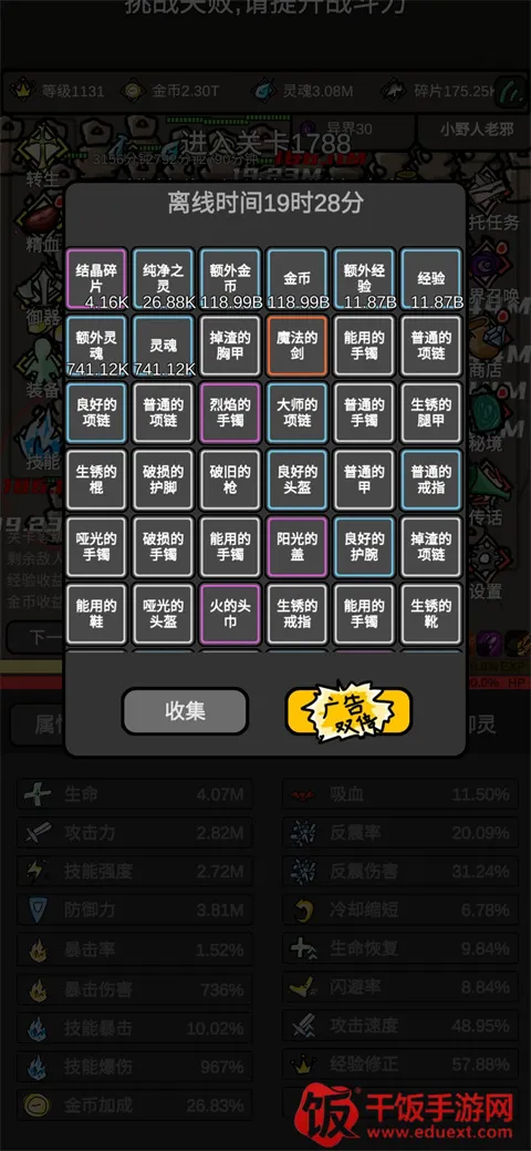 首先,下面的装备可以看到你掉落的装备,这边建议主要看蓝色词条,这个是装备十分重要的地方,我个人优先建议选择有经验加成的词条,然后通过重铸装备把经验拉到20%,达到最大,凑一个全身经验装备,接着抽一个用来打龙或者爬塔的装备,比如技能暴击伤害和攻击速度之类的,最好是想要自己要玩普攻还是技能,单一的走一条路线强点。不要金币反震血量和防御词条,这些在后期完全没用。