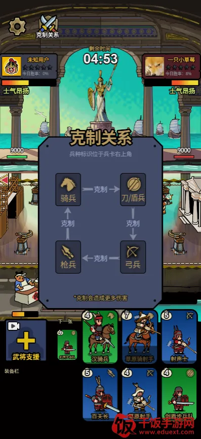 1. 兵种相克策略丰富:游戏中骑兵克刀盾,刀盾克弓兵,弓兵克枪兵,枪兵克骑兵,玩家可灵活运用相克关系排兵布阵,制定多样战术。