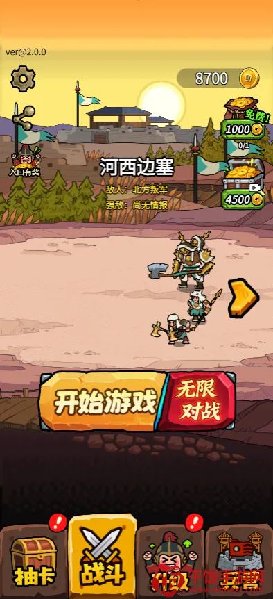 你想知道“菜就多练练”这个梗出自哪里吗?来探索这款对战游戏就能找到答案啦!游戏中,主线模式通关第三关后开启对战模式。在这里,消耗包子就能召唤对应兵种,各兵种相互克制,比如骑兵克刀盾,刀盾克弓兵等。每次击杀或被击杀会影响士兵士气值,士气值满可获振奋效果提升攻击力。主城前的箭塔能自动射击,击溃箭塔触发冲击波可清理敌军。战斗中还能召唤武将英雄,其独特技能可加成兵种,局外抽卡得武将,无限对战中武将是一次性消耗品,需持续抽卡。战斗结束后能进装备商店买装备,装备当天战斗生效。通过玩这个游戏,不仅能满足你对“菜就多练练”出处的好奇,还能体验精彩刺激的对战,在不断练习中提升实力,享受游戏带来的乐趣,解决你对游戏玩法探索的需求,让你沉浸其中,收获满满。