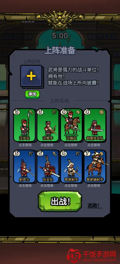 4. 武将英雄可加成:战斗中能召唤武将英雄,其独特技能对兵种加成,局外抽卡获取,虽为一次性消耗品,但持续抽卡可保持优势。