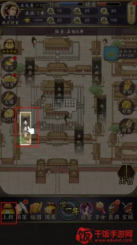 2、首先是上朝,随机点击兵部、礼部等上书奏折,根据选择来获取/减少声望、政务。