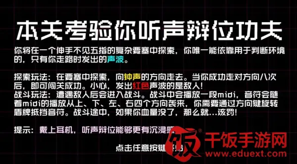 在这款游戏里,你将置身于伸手不见五指的巨大要塞,没有灯光、地图和视觉指引,只能依靠听觉生存。每一步脚步声会形成不同颜色和方向的声波,帮你辨别空间位置、走廊结构和敌人存在。探索时,要跟随钟声找到正确道路,迈步触发的声波会因不同方向的障碍改变反射方式,远处目标也会给予反馈。朝着钟声方向前进,连续八次走对就能离开要塞这一层。但要注意红色声波,那意味着敌人靠近。战斗时,进入节奏战斗模式,根据独特 midi 音乐,用方向键操作盾牌挡下来袭音符,错误或反应不及时会削减血量。戴上耳机体验,能更清晰感受各种声音,沉浸感大幅提升。这是一场对听觉与节奏反应的双重考验,是独特的声学冒险。