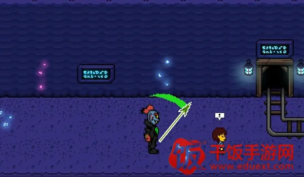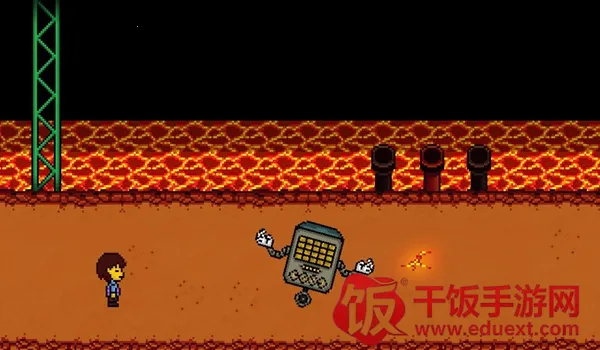 4、去到北面的藤蔓房间内会遇到青蛙froggit,选择“行动——赞美”,虽然青蛙不知道玩家在说什么,但他变得很开心,他就会逃离战斗。在右面的水池上有一个尖刺陷阱,Toriel会牵着玩家的手通过这个陷阱区域。