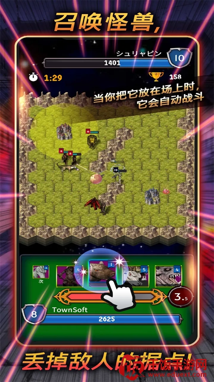 1. 独特战斗方式:通过点击召唤怪物自动攻击对手城堡,胜负不仅取决于力量,还涉及怪物兼容性、等级等多种因素,增添策略深度。