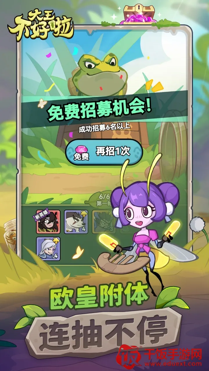 大王不好啦是一款以三国核心人物为主题的昆虫三国对战策略放置卡牌手游。融合休闲与冒险,有多样玩法、丰富英雄,可抽卡组队对战,还有多种特色系统及兑换码,无广告,带来独特三国冒险体验。