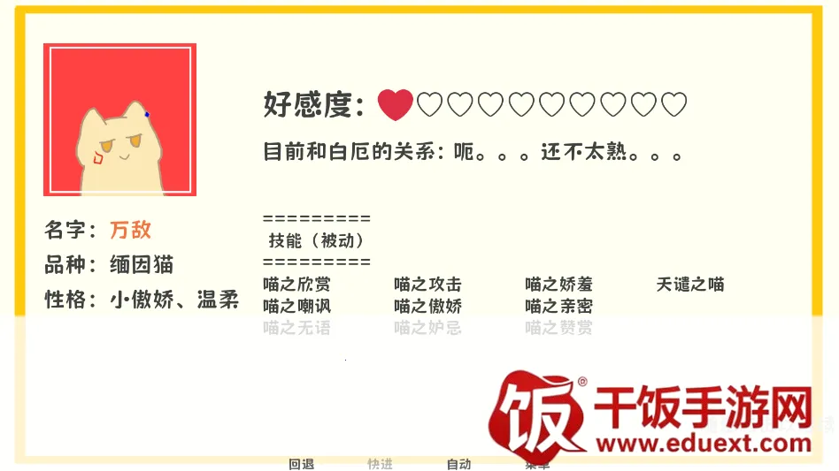 这款围绕崩坏:星穹铁道中厄敌 CP 展开的恋爱养成游戏十分有趣。它以恋爱和养成为核心,手绘风格画面搭配精致角色设计,视觉享受十足。38 个丰富事件,4 个独特结局,玩家能尽情编织自己的恋爱故事。操作简单流畅,适合休闲玩家,支持碎片化时间体验。每个角色个性鲜明,背景故事引人入胜,随着剧情发展,玩家会深入角色内心世界。白厄汪的可爱娇憨与万敌喵的神秘吸引,让玩家沉醉在它们错综复杂的感情中。而且还有个性化定制系统和内置社交系统,玩家可自定义主角、搜集服饰道具,还能分享心得攻略互动交流,增强游戏乐趣与参与感,总之是一款值得一玩的恋爱养成游戏。