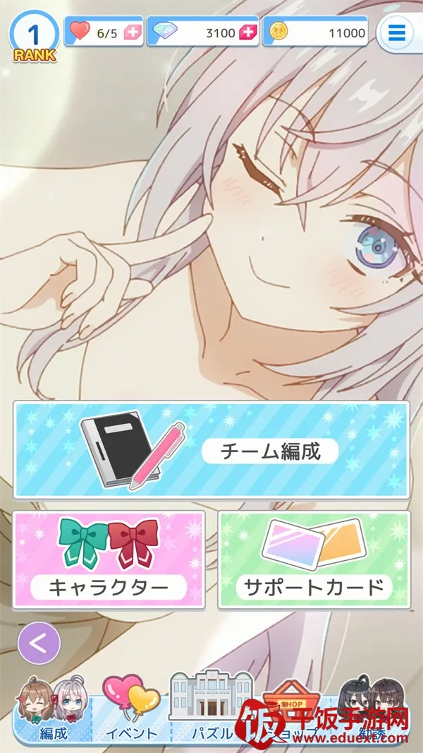 4、点击下方左边第一栏,中间靠上是队伍编成,可以设立不同队伍与角色搭配;中间靠左是战斗角色养成方面选项;中间靠右是支援角色养成选项。