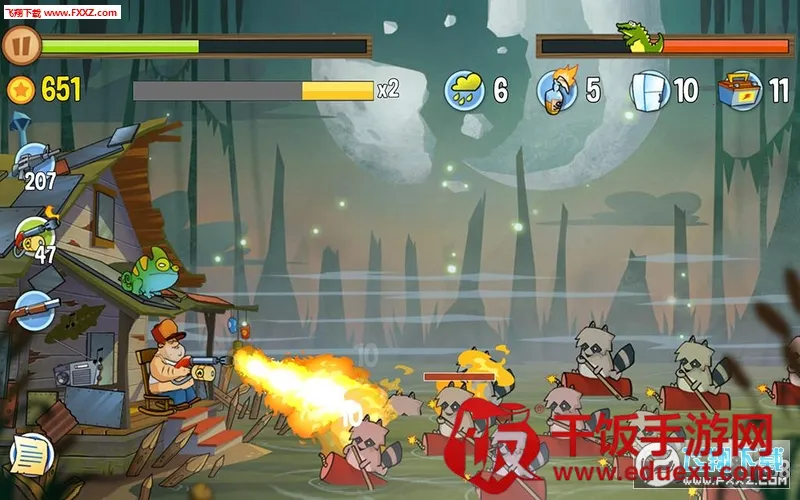 《沼泽派对》是一款独特的策略塔防游戏,充满美式幽默与荒诞风格。它以鲜明夸张的卡通美术设计,搭配乡村摇滚配乐,营造出轻松又紧张的氛围。玩家化身居住在沼泽边缘的大叔,手持武器抵御诡异生物侵袭。