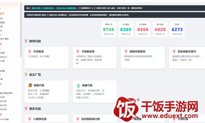 三角洲数据帝工具是腾讯热门游戏三角洲行动的攻略站点,提供实用攻略推荐。有今日制造、补卡攻略,首创且被抄袭仍在维护的卡战备系统,可查战绩日报、角色出场率等,实时战备交易行数据与游戏一致。