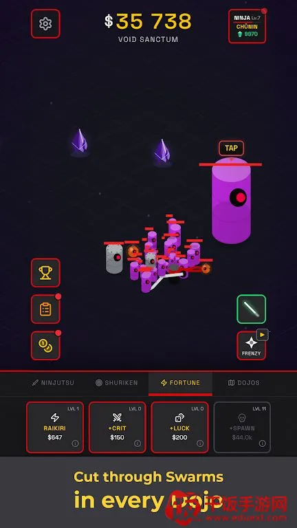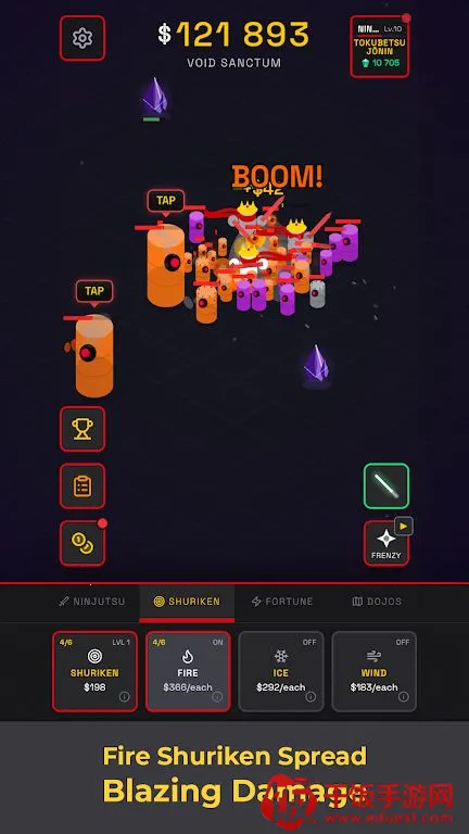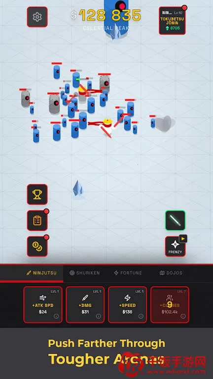 在《忍者放置竞技场》里,玩法超有趣。你的忍者会自动战斗,轻松抵御一波又一波敌人。你能解锁强大技能,比如多重分身之术,召唤影分身为你承受伤害、改变战局;雷切能释放强力雷电爆发。还可添加火冰风等元素手里剑,提升伤害又有独特风格。这里有50个独特道场等你探索,面对速度型、坦克型等各种敌人。战斗中点击宝箱和物品能获取奖励。你能用金币给忍者永久升级,提升伤害、攻击速度等战斗力。完成任务可获取经验值,从下忍晋升为忍者,解锁新道场、新敌人和更强大的角色。而且支持离线进度,随时回归变强。游戏上手简单,乐趣十足,适合热爱放置类动作游戏和忍者成长玩法的玩家。快来下载,让你的忍者一路变强,征服各个道场!