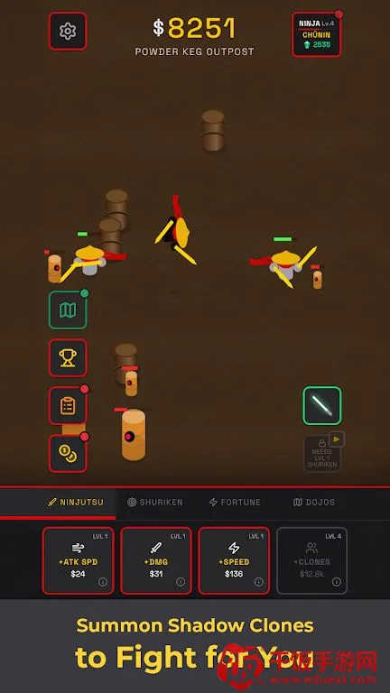 忍者放置竞技场最新手机版核心特色丰富多样。自动战斗超省心,让你轻松应对一波波敌人。能解锁强大技能,不断叠加升级,挑战更高难度竞技场。可在50个独特道场中培养忍者,清除成群敌人,持续变强。能召唤分身,释放雷切等强力技能,还可添加元素手里剑,提升伤害展现独特风格。面对各类敌人,战斗中点击宝箱物品获取奖励。用外观自定义忍者,成就感十足的成长体验稳步提升。支持离线进度,随时回归变强,专为热爱放置类动作游戏玩家设计。