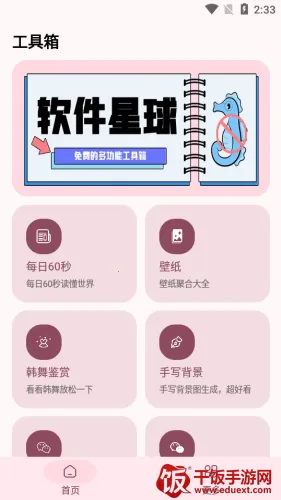 软件星球APP是多功能工具箱软件,界面清爽。能一站式发现新闻、壁纸等有趣功能,有专属个性舞台、生活便捷管家、海量资源宝库。可一键打开功能,如生成手写背景图等,还能浏览韩舞,使用方法简单。