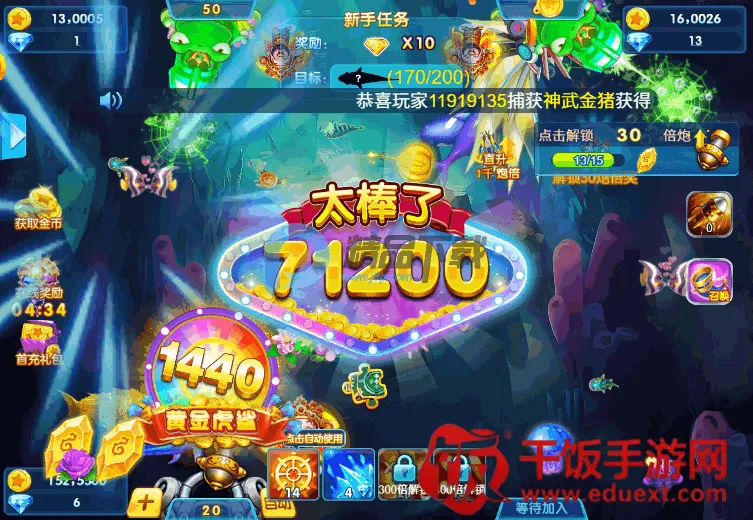 3、把握时机节奏留意特殊鱼和Boss刷新时间,提前准备。金币少时低倍率稳打,充足时高倍率冲刺,灵活调整策略。
