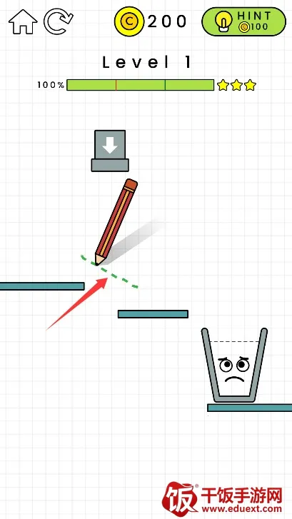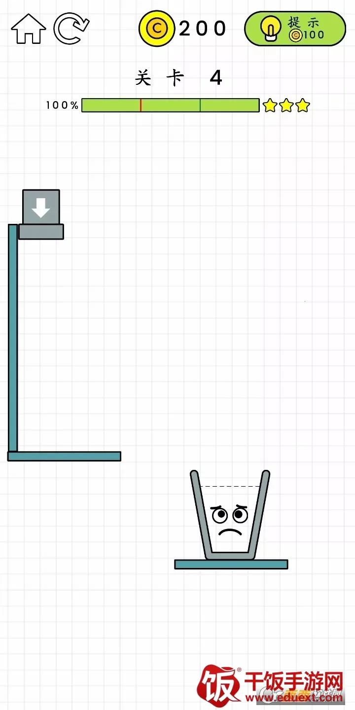玩法很简单,初次启动点击开始,然后在屏幕中画线封堵路径缺口,注意观察杯中标记的虚线位置,水位达到标准就能获满分评价。成功完成当前关卡后点击下一关继续挑战。