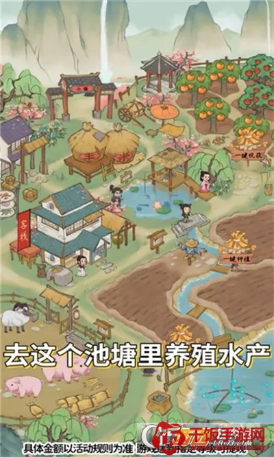 2、古风治愈画面:采用治愈系古风画面,温暖色调与细腻笔触,勾勒出令人向往的田园画卷,营造身临其境的经营氛围,让玩家沉浸于恬淡自得的田园时光。
