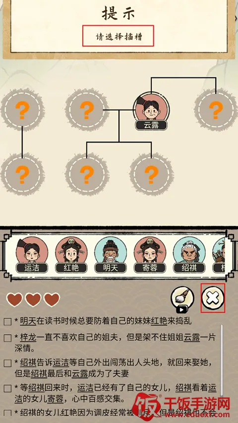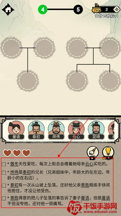 2、进入关卡后,玩家需要根据下方文字提示,将人物头像拖入上方合适圆框内,进行族谱的修缮。