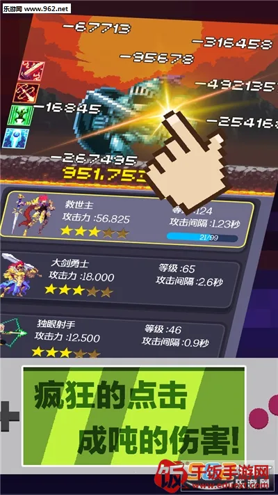 英雄挂个机最新手机版核心特色满满。其具有轻松休闲的挂机玩法,随时能体验游戏乐趣。游戏攻击模式超简单,点击就能造成高额伤害。拥有复古像素风格,能带你找回儿时感觉。可招募数十种不同属性英雄,自由组队。还有丰富养成体系,包括升级英雄、解锁技能,通过祭坛提升属性,击杀BOSS获取天赋提升攻击攻速与祭坛产出率。离线也能计算伤害,每点伤害还能转换成金币,让你轻松畅玩。