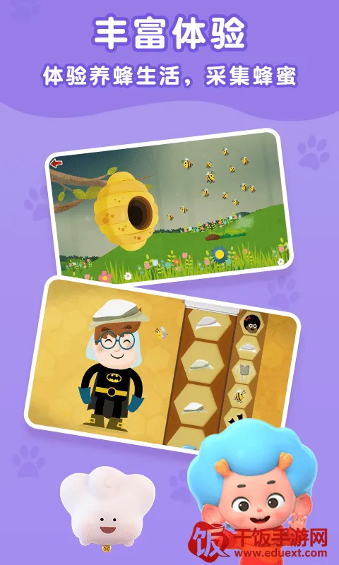游戏涵盖蜜蜂、蝴蝶、蚂蚁、甲虫等五大主题,通过互动动画实现沉浸式学习。包含储蜜、孵化蝴蝶、描绘甲虫等16种教育小游戏,加深对昆虫结构与行为的理解。科普动画采用儿童友好表达方式,助力孩子轻松认识名词和基础生物知识。