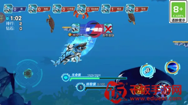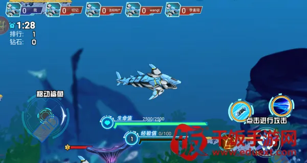 在攻略方面,操控小机械鲨鱼探索海底,点击攻击捕食猎物,吞噬小生物积累经验值。遇同类鲨鱼快速点击攻击进入对战,对战消耗生命值和经验值,要迅速结束战斗。