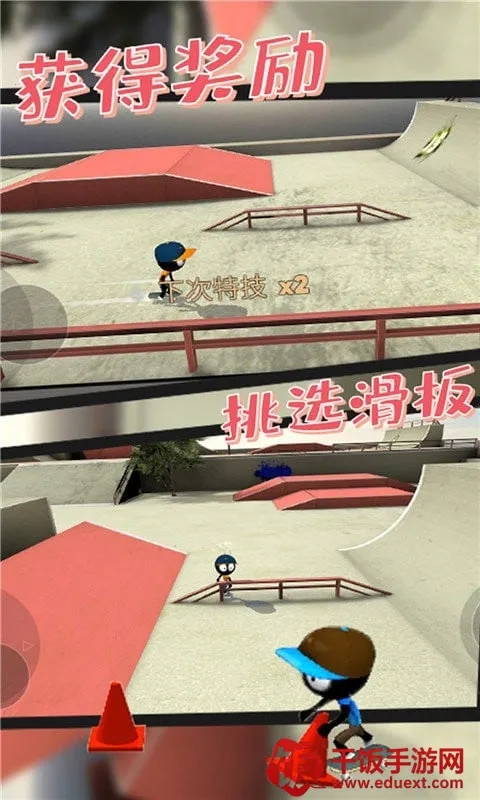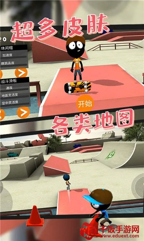 2. 操作简单有挑战:操作简单但极具挑战性,玩家通过灵活操作躲避障碍物、收集金币道具并完成任务,解锁新角色和滑板装备。