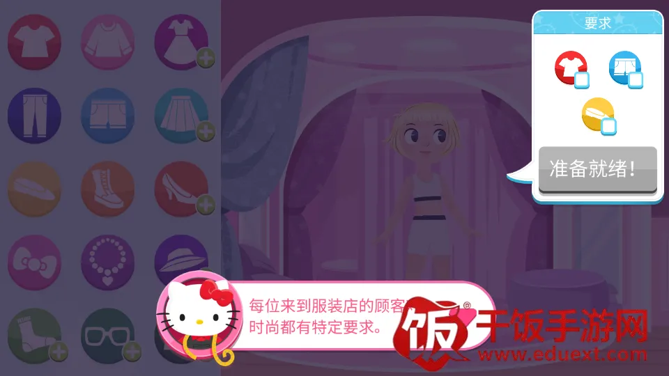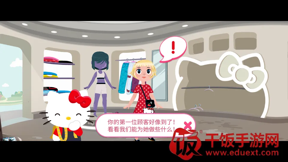 2、玩家将来到凯蒂猫的服装店铺,点击“!”接待第一位顾客。