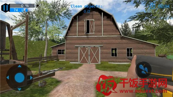 1、玩家可以按右边的水滴键,清理眼前物体,左边控制视角,需要无死角清理眼前的物体