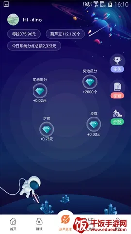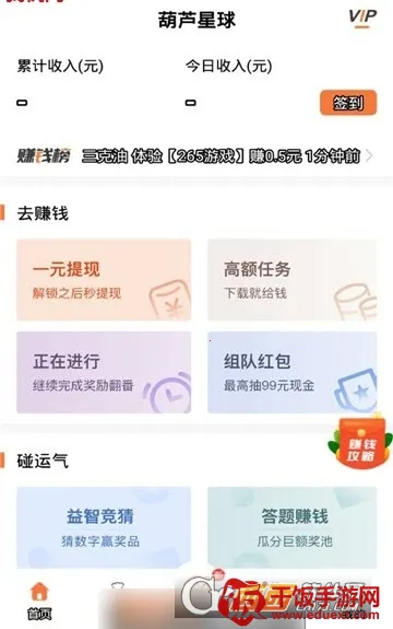 葫芦星球核心特色鲜明。赚钱方式灵活多样,涵盖试玩应用、游戏答题等,让用户能在娱乐中创收。低门槛高回报,无需本金,完成任务就能得现金奖励。提现快速便捷,支持1元提现且秒到账,还有20元及以上提现选项。奖励丰厚,邀请好友有额外奖励。界面简洁操作便捷,用户体验佳。注重安全,保护用户数据隐私。任务定期更新,赚钱机会源源不断,无论是利用碎片时间还是想轻松赚取零花钱,葫芦星球都能满足。