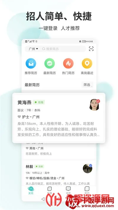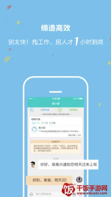 3、沟通便捷顺畅:求职者可直接与雇主在线交流,省去繁琐简历投递步骤,加速面试流程,最快一小时到岗。