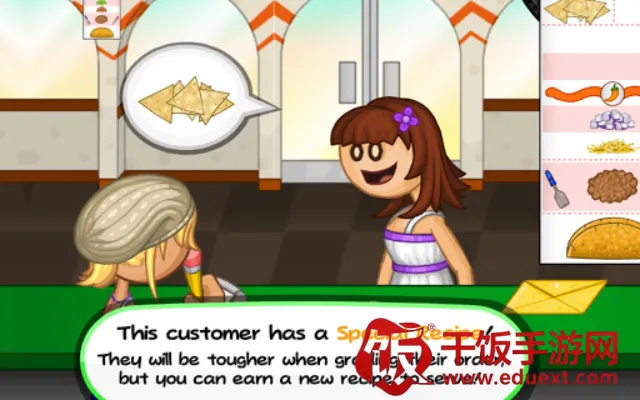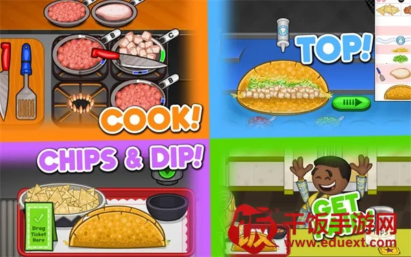 这是一款美式卡通风格的模拟经营养成游戏。玩家要亲手经营一家塔可店,按照顾客需求制作不同口味的塔可卷饼。赚取金币后可投资升级店铺设施,吸引更多客人。