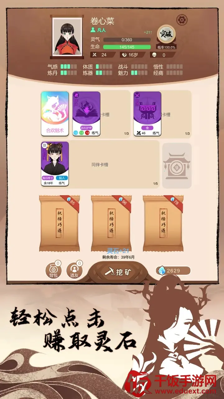 游戏玩法丰富,可自动挖矿积攒资源兑换卡包,还有各种放置玩法。这里有大量不同类型卡牌,每张都有独特属性和技能,能自由组合创造专属修炼风格。玩家完成任务、挑战关卡、挂机可获经验资源提升角色等级,离线也能自动挂机获取经验。