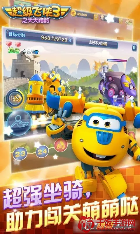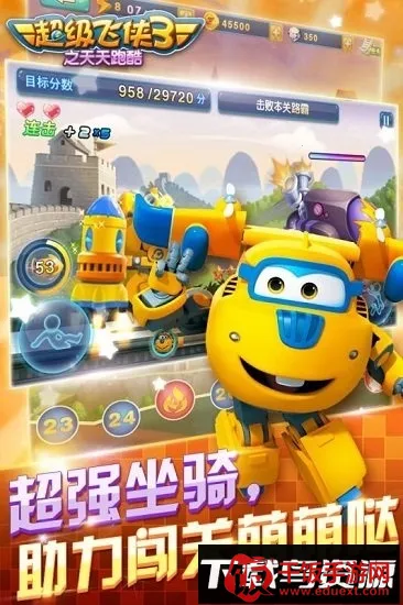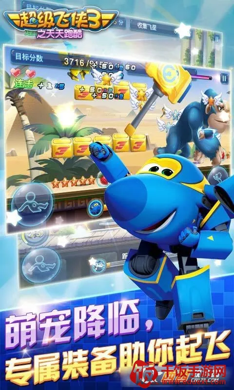 超级飞侠3之天天跑酷是官方正版授权的休闲跑酷游戏,以经典动画为背景。有超萌画风、简单实用技能、华丽特效,还有创新boss挑战。特色是正版剧情、多样道具、超帅坐骑萌宠等,带来畅快跑酷体验。