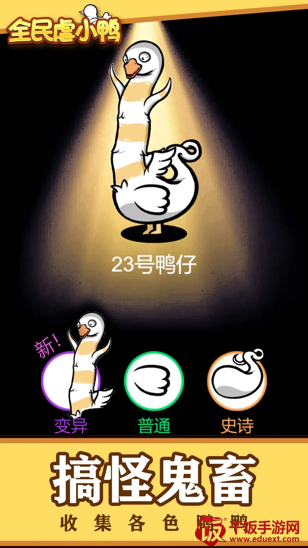 全民虐小鸭免广告是一款益智休闲小游戏,以魔性合成变异养鸭为核心。玩家通过合成孵化变异小鸭闯关冒险,操作极简,玩法友好,画风新奇治愈,能让人在碎片时间放松解压,上线即登热门榜。