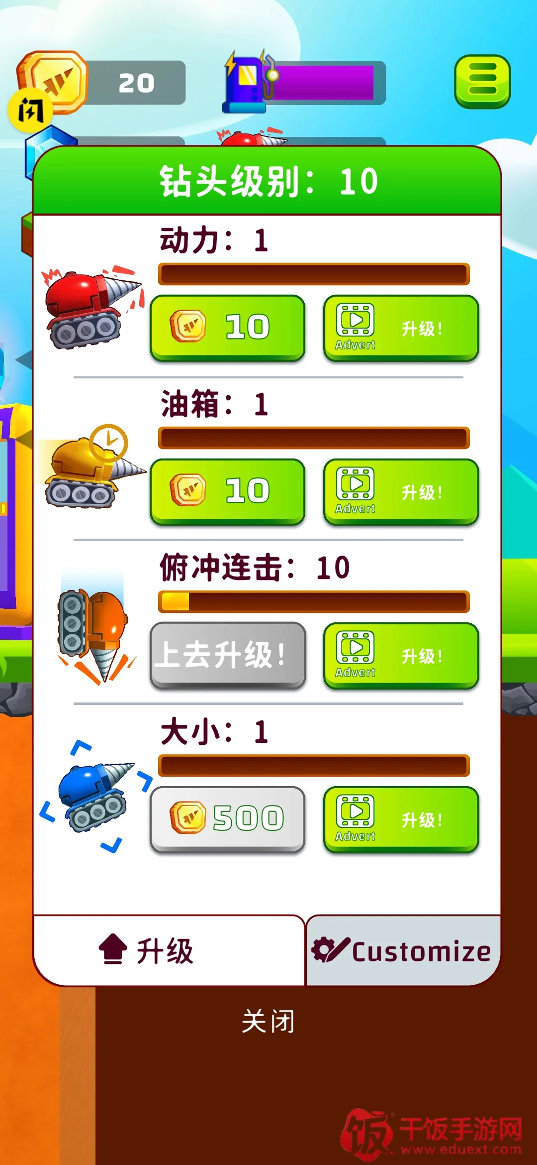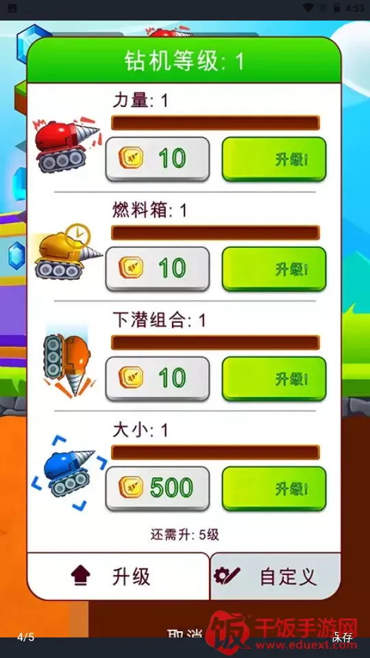 4. 升级挖掘能力:能升级钻头各部分提升挖掘能力,如升级轮子增速度机动性、升级油箱延使用寿命、升级钻头尺寸挖得更深。