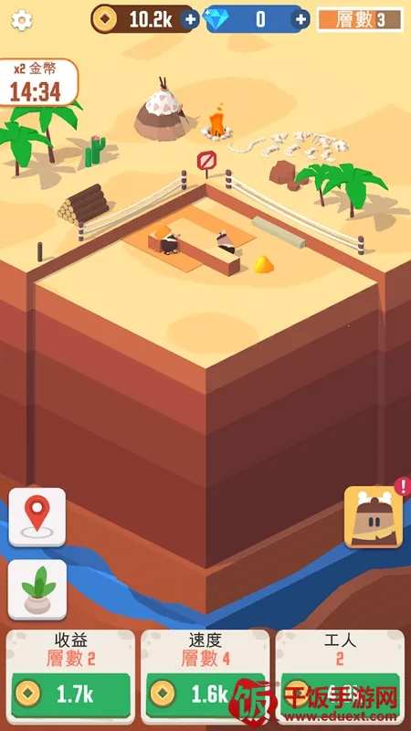 1、轻松休闲玩法:采用放置类玩法模式,画面简洁但玩法丰富,指尖点击操作提升挖矿效率,还能自由建造建筑,收获更多乐趣。