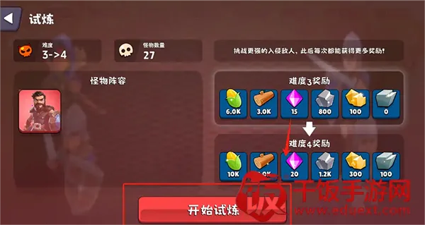 点击入侵之后,可以看到右上角有一个试炼按钮。点击试炼,会升级难度,增加敌人数量及战力。但是后续可以获取更多的紫宝石哦!