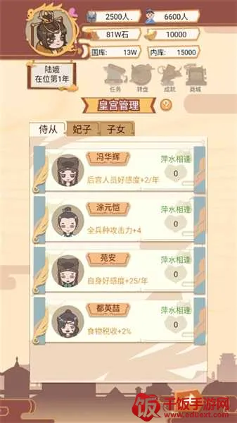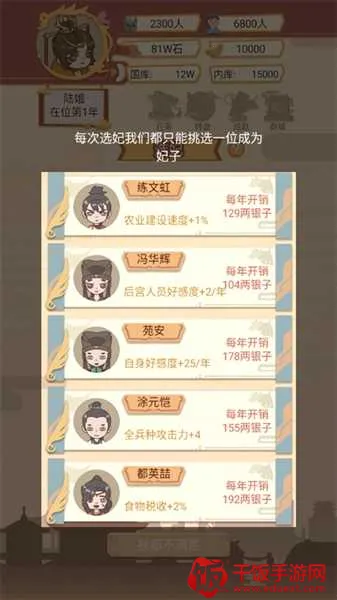 4、皇宫管理:统筹后宫人员编制与俸禄发放,侍从好感度满值后可晋升为妃子,属性加成翻倍,但年度开支同步大幅上升。