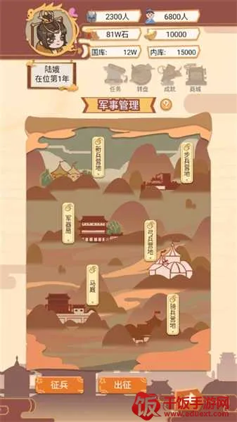 3、军事管理:升级四大兵种营地(步、骑、弓、工),增强征兵容量与部队战力,还可亲自率军出征平定叛乱或开疆拓土;